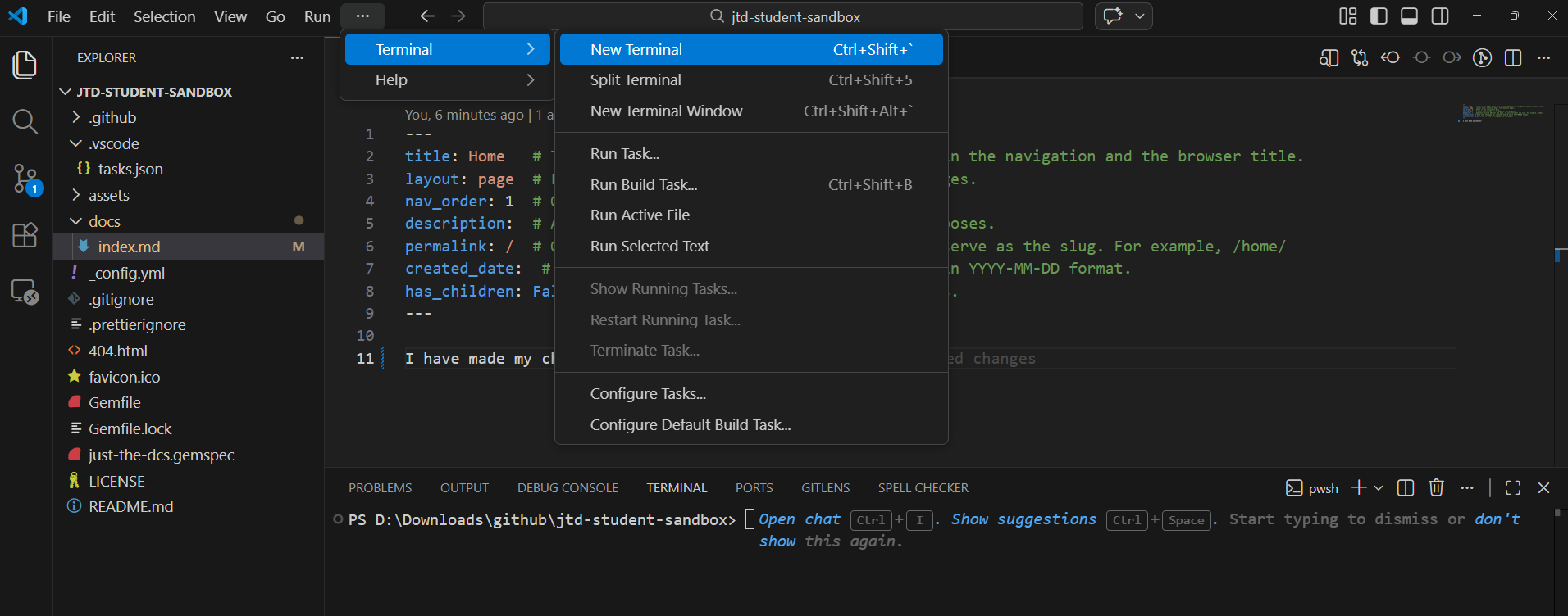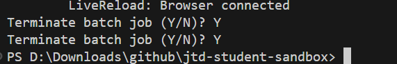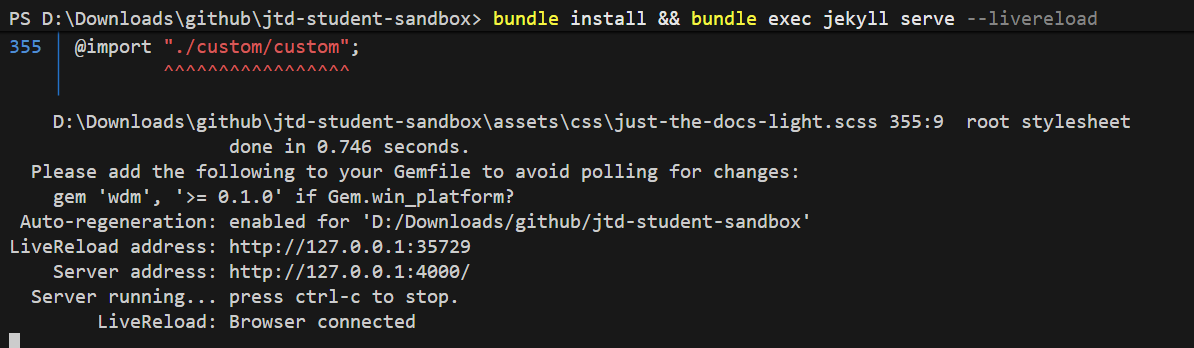 ... You can add fiddle to your Gemfile or gemspec to silence this warning. LiveReload address: http://127.0.0.1:35729 Server address: http://127.0.0.1:4000 Server running... press ctrl-c to stop.To stop the preview server, you can go back to the terminal (click on the terminal window in VS Code) and press Ctrl+C to stop the server. If you asked to ‘Terminate batch job (Y/N)?’, type ‘Y’ and press Enter (two times) to confirm stopping the server.