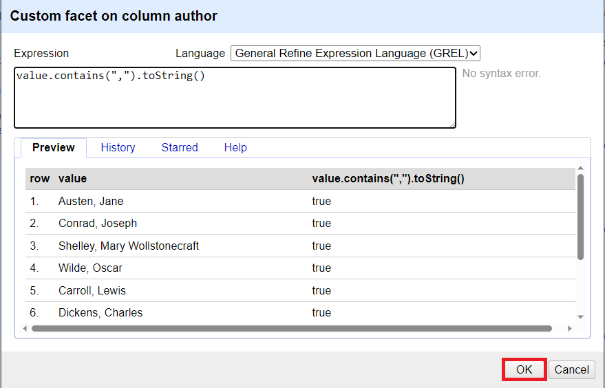 This creates a new facet and returns true if the name has a comma, and false if there isn’t one. Select true from the facet box to only show those records. This will focus our next expression only on those names with commas.