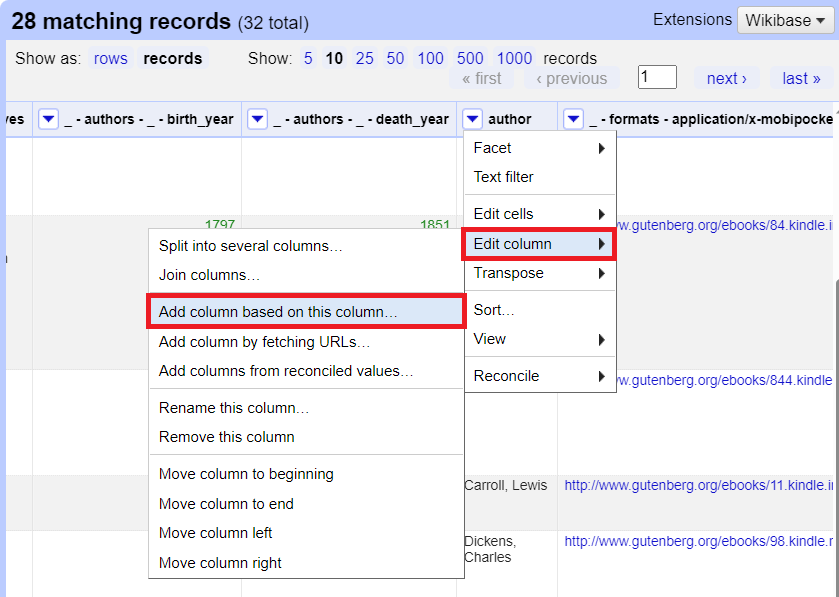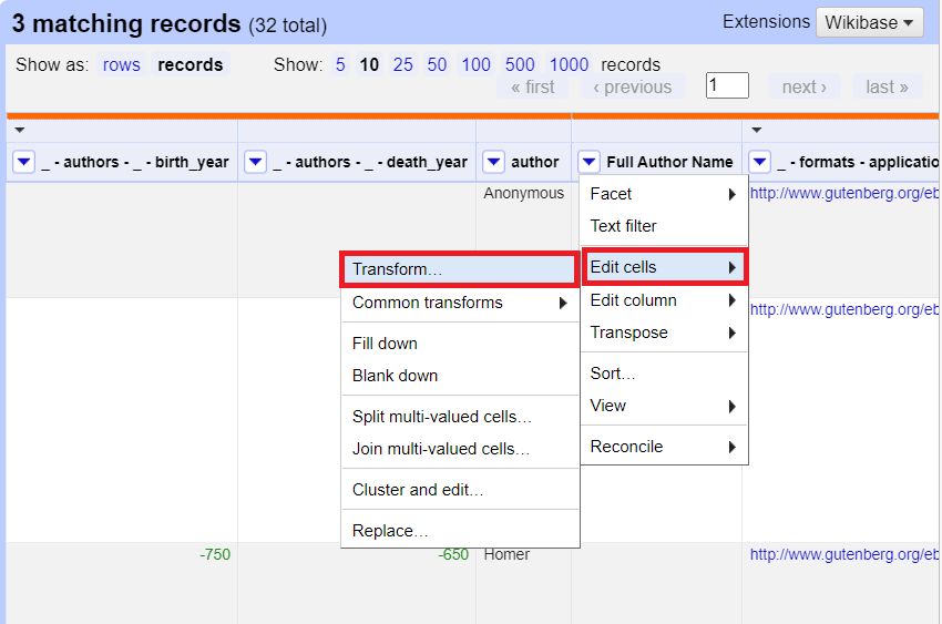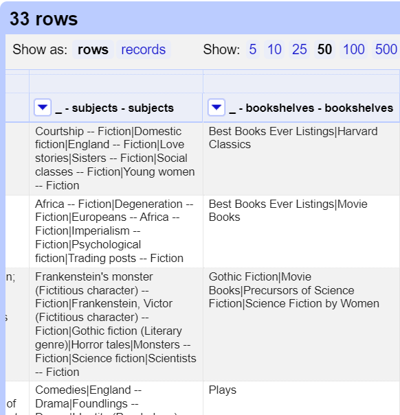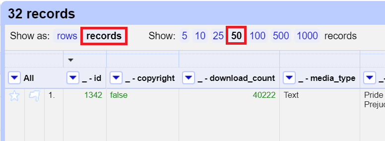 There should be 32 records and 178 rows. Records can have one or more related rows in them that identify a unique object and share the same first column. In this case, we have 32 records corresponding to 32 books. Each book has multiple rows to provide information on its various subjects, bookshelves and authors. Sometimes it is useful to keep your data in multiple rows, grouped by records, to have these different elements to facet or to use to derive new columns. For our example, let’s display it as records and show 50 so that we can view our whole dataset on one page.