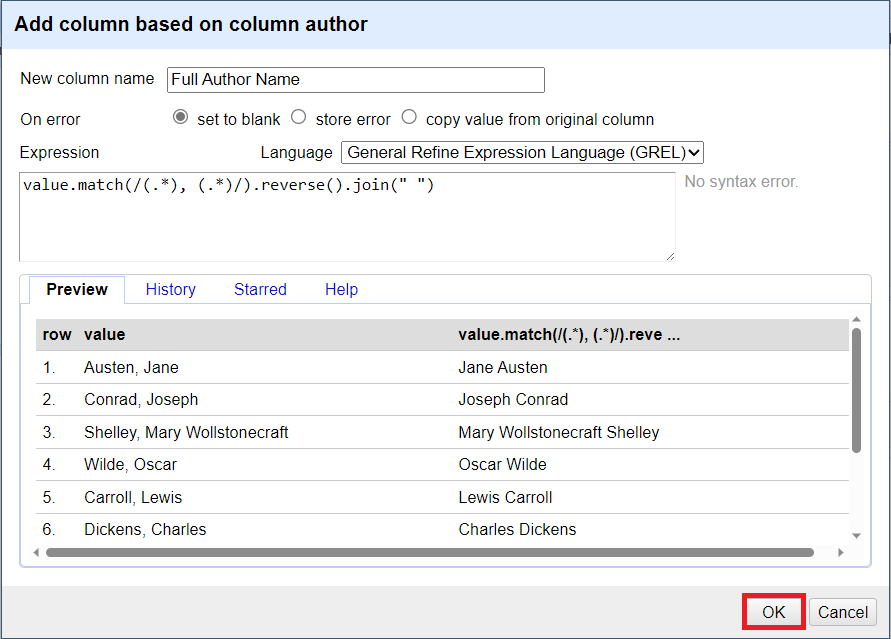 Then click on OK. This will copy these author names into the new column, without any changes.