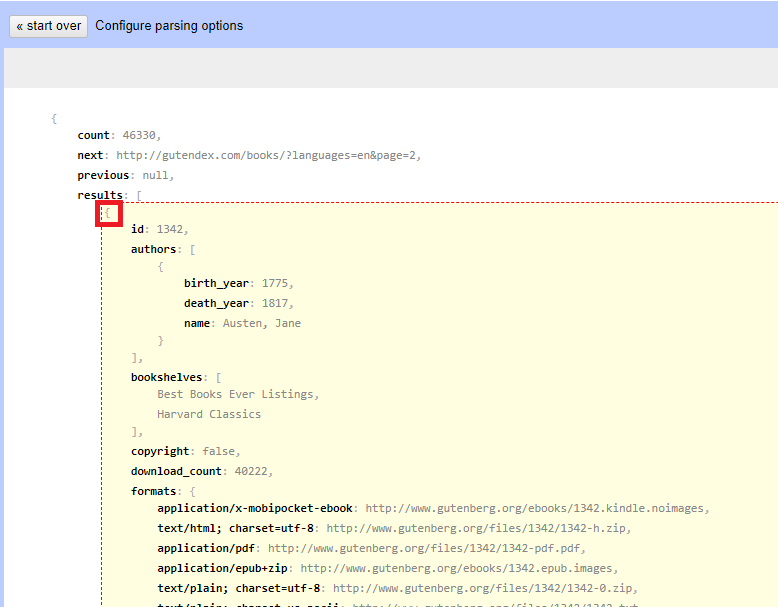 OpenRefine has recognized the data as JSON, but it needs our help to make sense of it. We need to click on the JSON preview to highlight what a complete individual record is within the curly brackets. Hover over the curly brackets just below the words results at the top of the file. That should highlight the lines of JSON that pertain to an individual record. This is an example record to tell OpenRefine how to parse the file. Click on that curly bracket to select it.