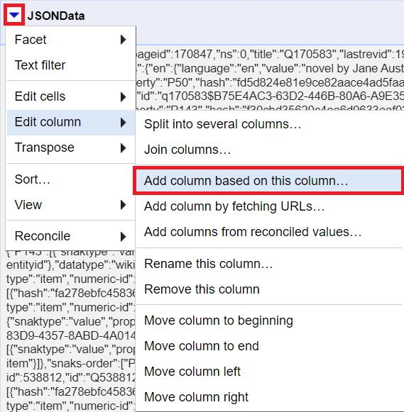 11. From the JSONData column pull down menu, select edit columns > add column based on this column and give it the name First Line.