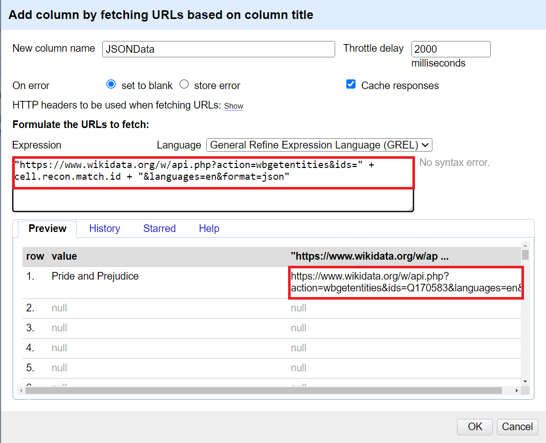 The goal of this activity is to try out using the Add Column By Fetching URLs feature by using the Wikidata API to add the property “first line” to our data (the first sentence of a particular book). You could also add the property “first line” using the Add columns from reconciled values… feature, as we did in Activity 2, but we will use this property as an example of a different way to access this data. We will make an API call, and then parse the resulting JSON data for the property information we want. This is a normal workflow when augmenting data with APIs.