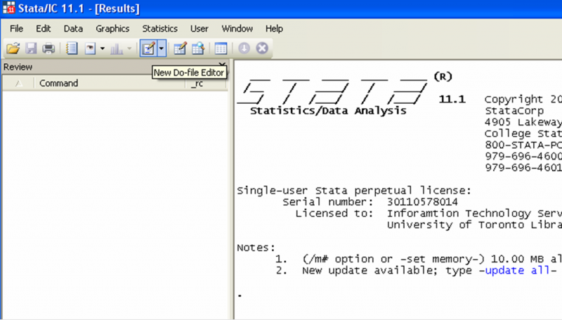As you become more proficient with programming in Stata, you won’t need to try out commands anymore, and you’ll discover the joy of writing a do-file and having it run without a glitch. To run a whole do-file, do not highlight any part of it and click on the “Execute Selection (do)” icon.
