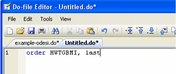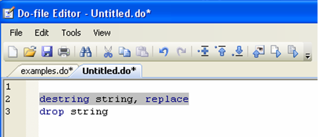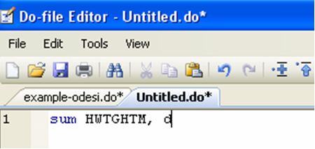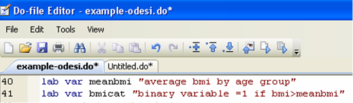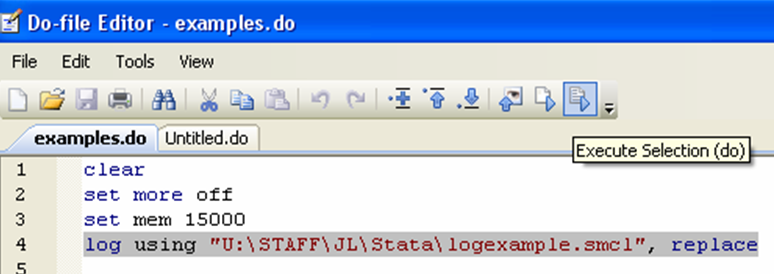 In the preliminary stages of your work, you may feel that a do-file is more hindrance than it is useful. For example, if you are not so familiar with a command, you may prefer to try it first. One simple way to do that and still have discipline about writing do-files is to write your do-file in stages, writing only a few commands before executing them, correcting mistakes as you go. In order to execute a number of commands rather than the whole do-file, simply highlight the ones you want to execute, and click on the “Execute Selection (do)” icon on the top of your do-file editor, at the far right.