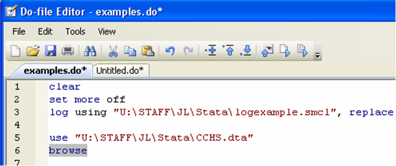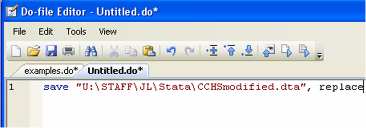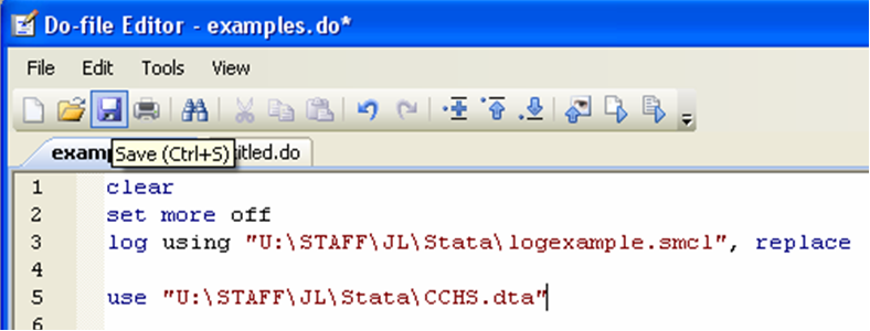 Save as you go. Computers crash, power goes out, stuff happens. Save your do-files every few minutes as you write them. Saving a do file is done the same way as saving any text editor document: either click on the diskette icon, or press “CTRL+S”: