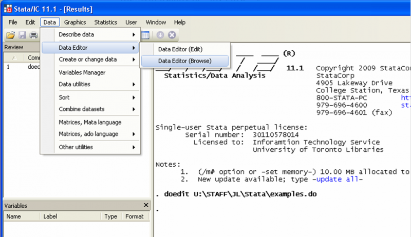 Let’s try running it in one go to see if it works. Do not highlight any command and click on Execute (Do). Note that whenever Stata encounters the command “browse” a data editor will pop up on your screen. Have a look at your data then close the data editor in order for Stata to continue running the do-file.