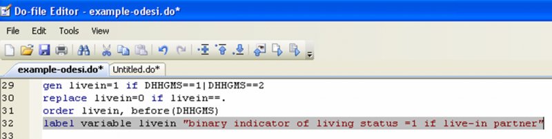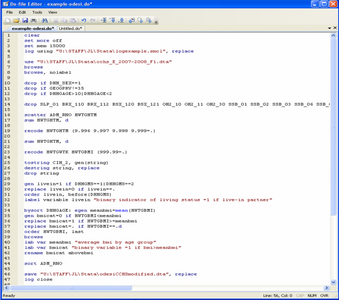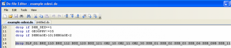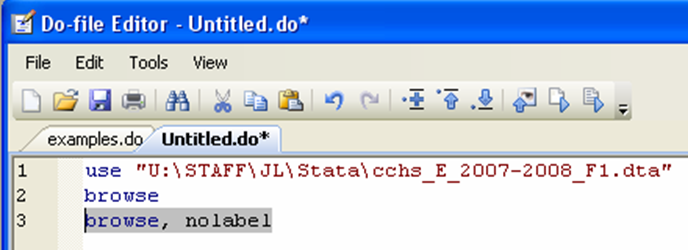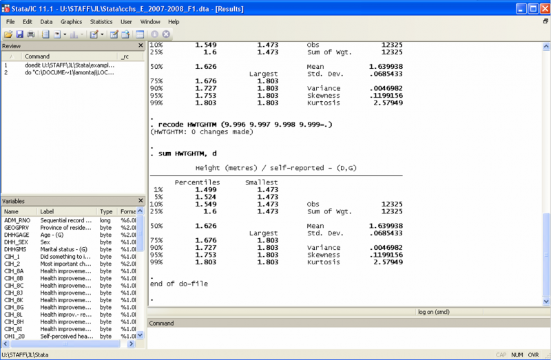 You may wonder about the commands “clear”, “set more off” and “set mem 15000” in the screenshot example. These three commands are administrative commands that are quite useful to have at the beginning of a do-file. The first, “clear”, is used to clear any previous dataset you may have been working on. The command “set more off” tells Stata not to pause or display the –more– message. Finally, the command “set mem 15000” increases the memory available to Stata from your computer; here we will need it as the size of the data set we downloaded from Odesi [3] is larger than the 10mb allocated to data by default.