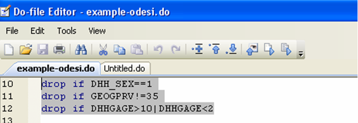 There are many reasons why you may want a smaller subset of your data but the main one is that the bigger the dataset, the harder it is for Stata to manage, which slows down your system. Your goal is to make your dataset as small as possible, while keeping all the relevant information. Your research agenda determines what your final dataset will contain. bundle Let’s say you have data on the health habits of Canadians aged 12 and up, but your research question is specific to women of reproductive age living in Ontario [8]. You clearly don’t need to keep the men in your dataset, and you won’t need to keep the residents of provinces other than Ontario. Furthermore, you can probably drop women under 15 and over 55 years old. Now, let’s look at how you would do that.