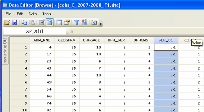 Looking at the data from CCHS, the variable SLP_01 (Number of hours spent sleeping per night) is coded as “.a” (NOT APPLICABLE) for each observation in the dataset.