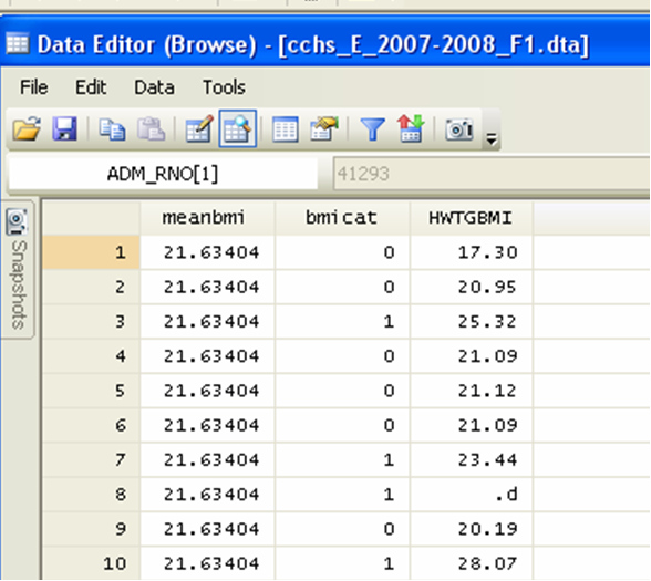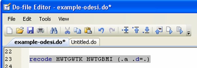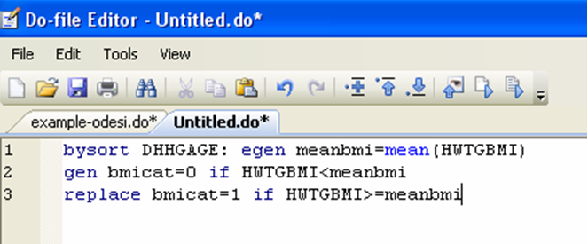 Do you notice the problem on line 8? The variable bmicat should not be coded 1 if the original BMI variable is coded as a missing value. We can fix this with a quick replace: