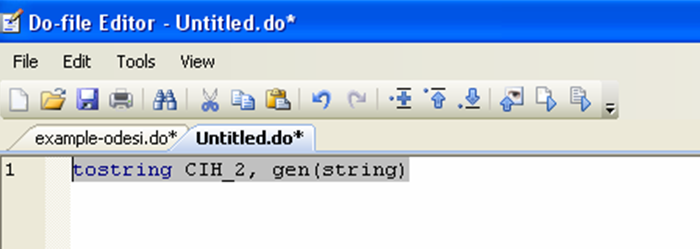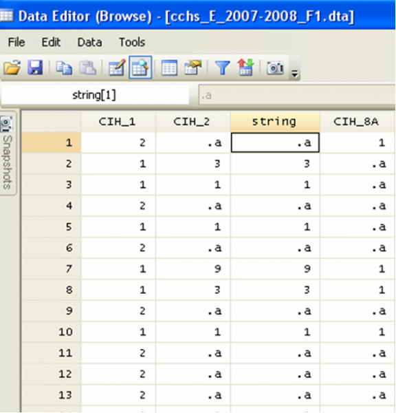 The “destring” command allows you to convert data saved in the string format (i.e. alphanumeric) into a numerical format. The CCHS dataset does not contain any string variable. In order to see what a string variable looks like, we can use the converse command, “tostring”, to create a string variable. We will then convert that variable back to a numerical format.