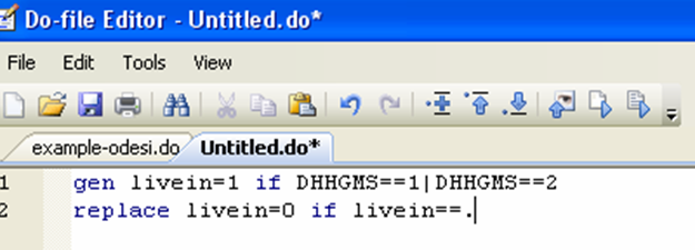 The first line creates the variable “livein” and assigns it a value of 1 if the value of the marital status variable (dhhgms) is either 1 (married) or 2 (common-law). The second line replaces the missing value code by 0, making the “livein” variable binary.