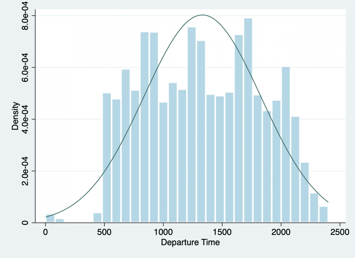 hist deptime, normal bin(30) color(ltblue) lcolor(white) xtitle(Departure Time)