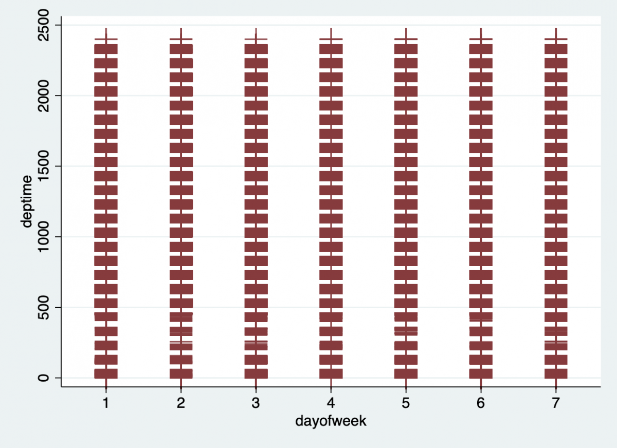 scatter deptime dayofweek, msymbol(+) msize(huge) mcolor(maroon) xlabel(1(1)7) plotregion(margin(10 10 2 2))