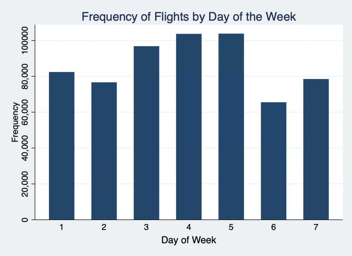 graph bar (count), over(dayofweek) title(Frequency of Flights by Day of the Week) ytitle(Frequency) b1title(Day of Week)