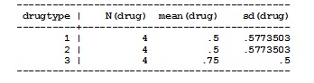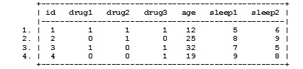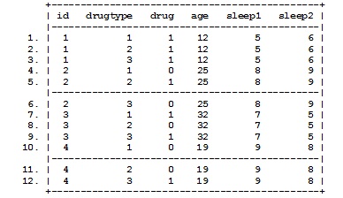 To reshape a data set between wide and long format, use the reshape long or reshape wide commands. For a data set in wide format, the variables that denote the repetition should be named with the variable name followed by a number (i.e. variablename#). For example, in our data set we have drug1, drug2 and drug3. The numbers do not need to be consecutive.